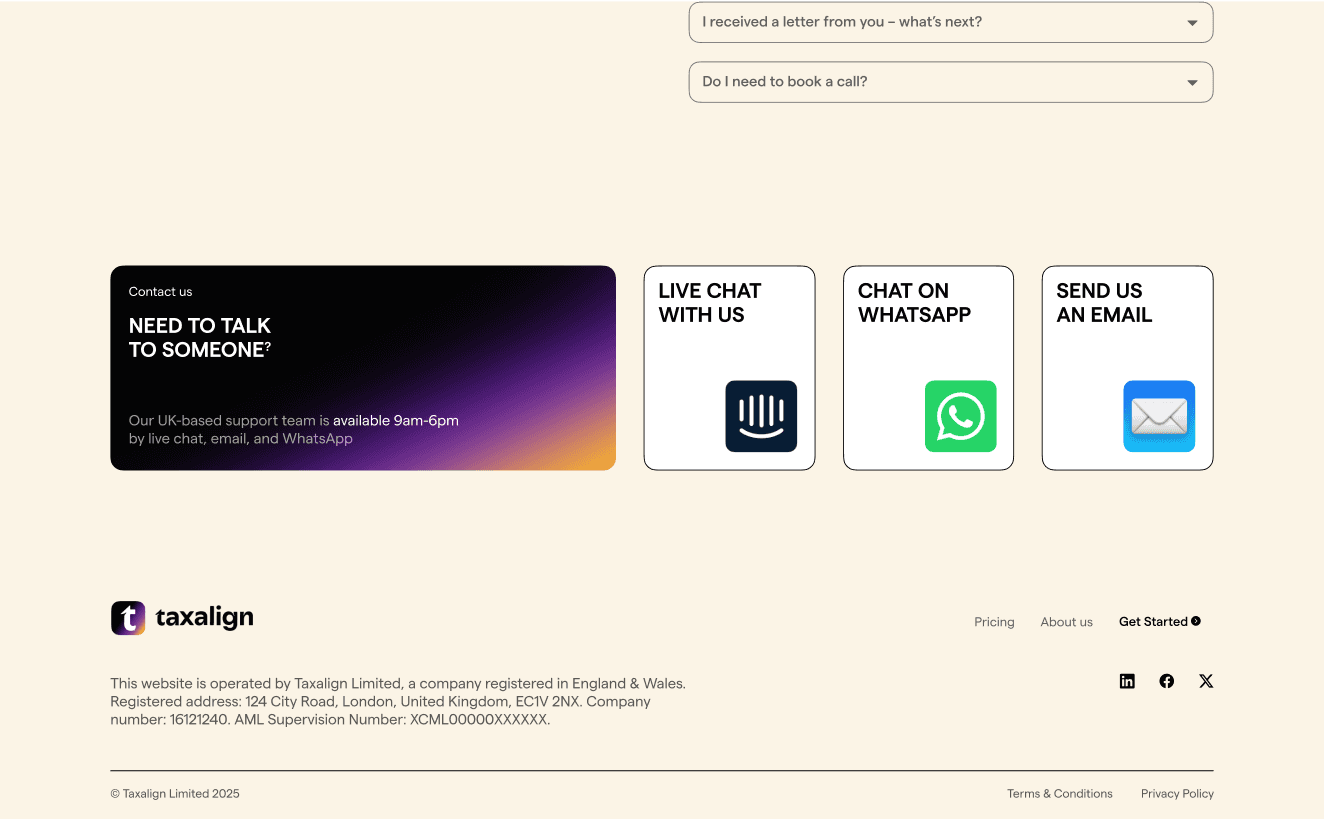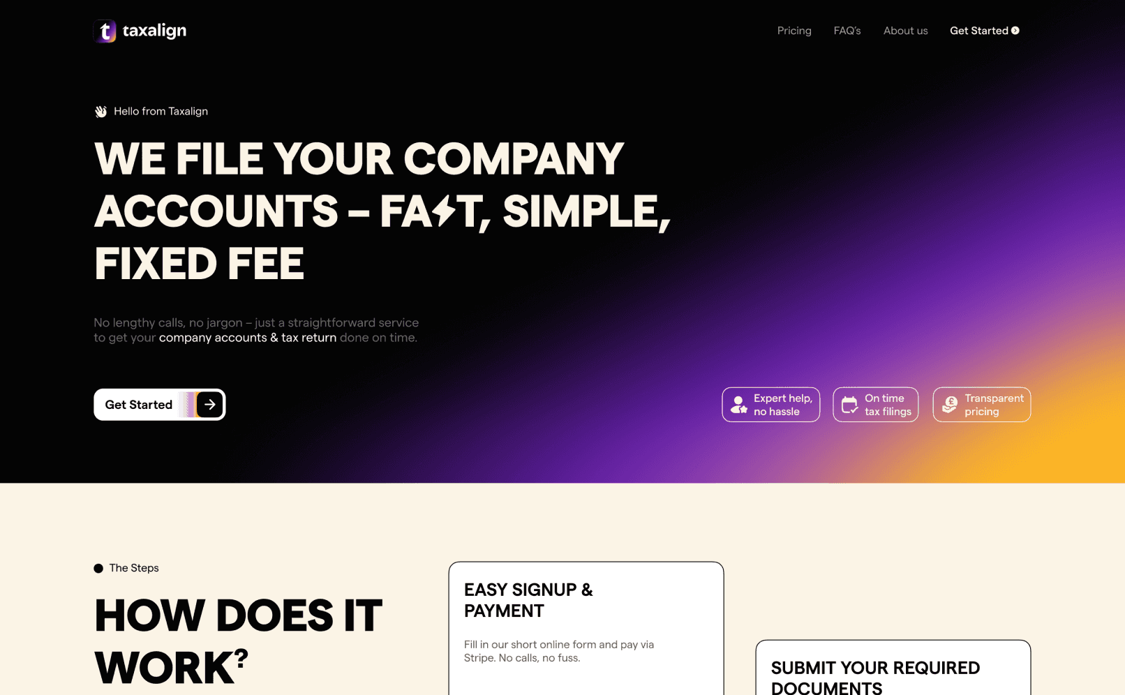 Taxalign is a new UK-based accounting startup that wanted to make company accounts and tax filing easier for small businesses. Instead of following the usual corporate look most accounting websites use, we designed a single page landing experience that feels modern, friendly, and easy to understand.
